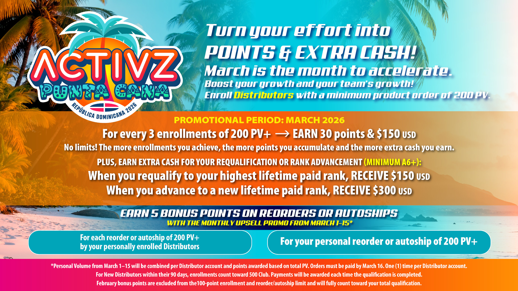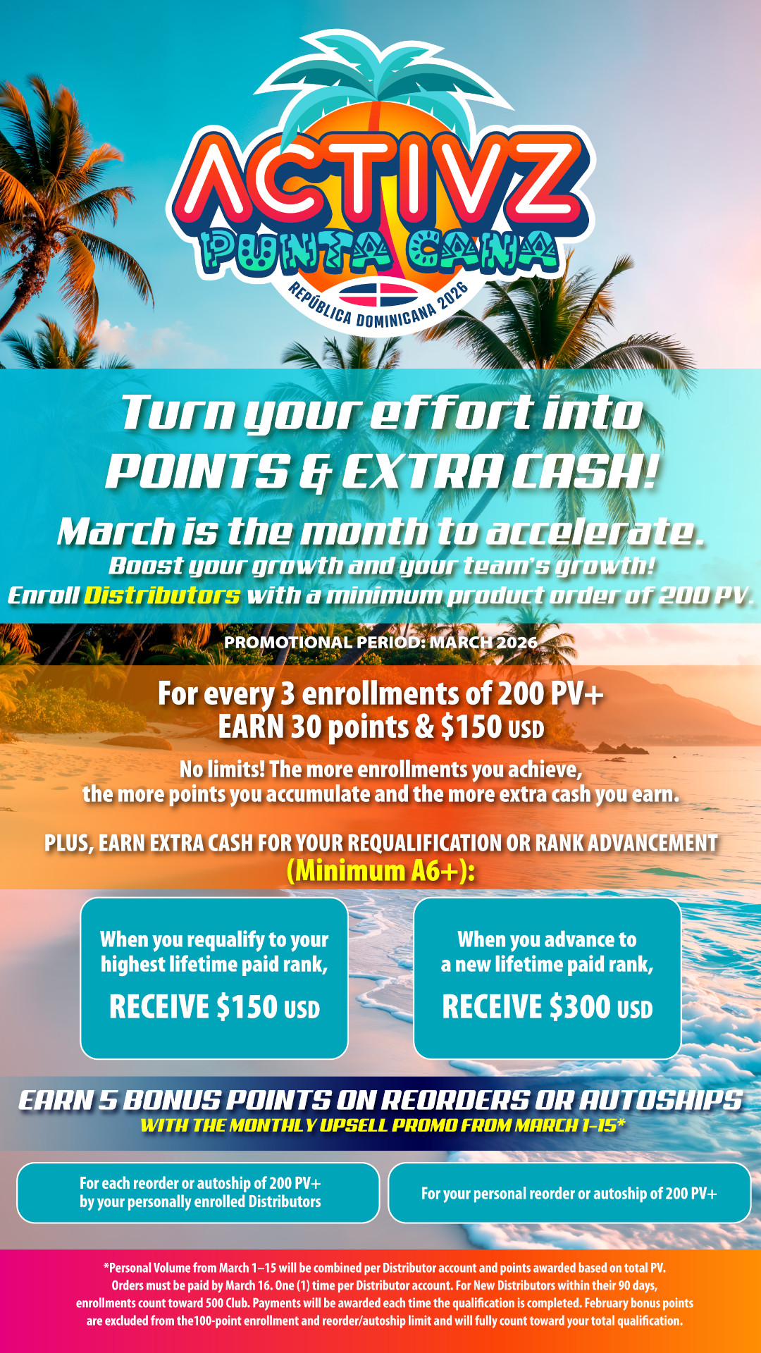 • Must meet the compensation plan Personal Volume requirements every month during the qualification period.